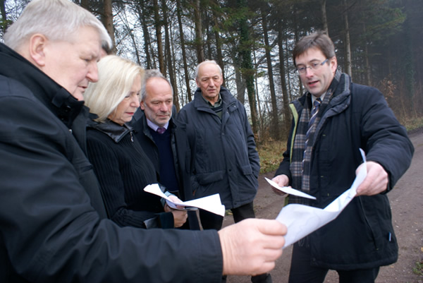 Gruppenbild mit Dame: Johanna Wanka lässt sich von Diplom-Ingenieur Wilhelm Meyer (rechts) erklären, wie ein Klappstauwerk funktioniert. Auch der CDU-Landtagsabgeordnete Hans-Heinrich Ehlen (von links) sowie der Vorsitzende vom Unterhaltungsverband Obere Oste, Angelus Meyer, und Ausschussmitglied Hinrich Kackmann verfolgen Meyers Ausführungen.