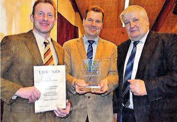 Preisübergabe durch Hans-Heinrich Ehlen (rechts), Vorsitzender der Stiftung Kulturlandpflege, an Harald Hauschild (links) und „Bunte Felder“-Geschäftsführer Dr.Hartmut Schröder.