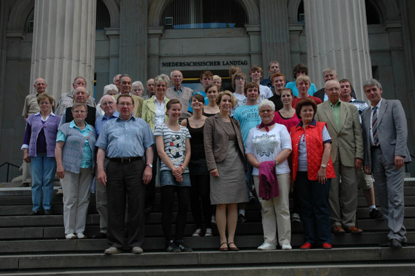 Pressebericht über den Besuch der Senioren-Union Rotenburg und Gymnasiasten aus Bremervörde im Landtag am 10. Juni 2010 Zeven/Sittensen/Bremervörde. Auf Einladung des Landtagsabgeordneten Hans-Heinrich Ehlen führten kürzlich die Senioren-Union Rotenburg und Schülerinnen und Schüler des Gymnasiums Bremervörde gemeinsam einen Besuch beim Niedersächsischen Landtag mit Teilnahme an einer Landtagssitzung in Hannover durch. Geleitet wurde die gesamte Gruppe vom Vorsitzenden der Senioren-Union Rotenburg, Heinz Helbig aus Sottrum, sowie Schriftführer Alfred Rathjen aus Westerholz, bei dem auch die Vorbereitung lag. Die überwiegend aus dem Raum Zeven/Sittensen und Scheeßel kommenden Senioren unternahmen auf der Hinfahrt einen Abstecher zum Wisentgehege in Springe, wo unter fachkundiger Führung des Leiters Joachim Henning ein ausgedehnter Rundgang durch das Gehege mit ausführlicher Erläuterung zu den in unmittelbarer Nähe zu betrachtenden verschiedenen Wildarten, wie z.B. Wisente, Rot- und Damwild, Füchse, Otter, unternommen wurde. Mit großem Interesse konnte hierbei das Zusammenleben in einem gemeinsamen Gehege von Wölfen und Braunbären verfolgt werden. Eine Freiflugvorführung mit heimischen Greifvögeln auf dem Falknerhof in Gegenwart vieler Kinder mehrerer Schulklassen rundeten hier das Bild einer stark veränderten Struktur des Wisentgeheges im Saupark Springe in Richtung Darstellung für die Öffentlichkeit ab. Im Landtagsgebäude in Hannover konnten die Teilnehmer nach Einweisung und Film über Landtag und Landtagsarbeit von der Besuchertribüne über eine Stunde den Verlauf der Debatte der Landtagssitzung verfolgen, bei der die Beantwortung einer Vielzahl mündlicher Anfragen im Vordergrund stand. Die Abgeordneten der Wahlkreise Rotenburg und Bremervörde, MdL Hans-Heinrich Ehlen aus Kalbe, Mechthild Ross-Luttmann aus Rotenburg, Jan-Christoph Oetjen aus Sottrum, Ralf Borngräber aus Rotenburg und Elke Twesten aus Scheeßel standen in dem anschließenden Gespräch Rede und Antwort zu ihrer Arbeit im Landtag und zu gestellten Fragen zu verschiedenen Themen, insbesondere Bioenergie. Das obligatorische Gruppenbild vor dem Landtagsportal durfte natürlich nicht fehlen. Auf der Rückfahrt wurde im Bus noch ausführlich über die sowohl im Wisentgehege in Springe wie auch im Landtag in Hannover gewonnenen Eindrücke diskutiert.