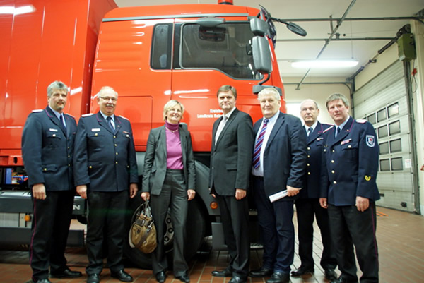 Das System konnte im Rahmen eines technischen Pilotversuches realisiert werden und blieb von den Kosten deutlich unter den marktüblichen Konditionen. Die Effizienz ist ebenfalls überzeugend – vom Notruf bis zur Disposition von Rettungskräften vergehen maximal 60 Sekunden. Anschließend wurde die Atemschutzübungsstrecke besichtigt, durch die alle etwa 1.600 Atemschutzgeräteträger einmal jährlich geschleust werden müssen, um ihren jährlichen Leistungsnachweis zu erbringen. In der Werkstatt der FTZ, in der Fahrzeuge und Gerät der Feuerwehren instandgesetzt werden, war das Fahrschulfahrzeug der Feuerwehr zu besichtigen – eine weitere Erfolgsgeschichte des Landkreises Rotenburg.