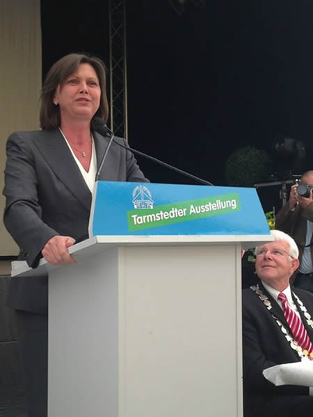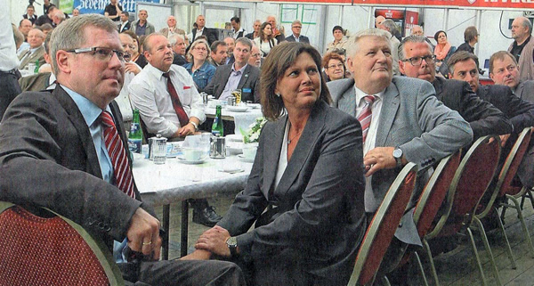 Die Eröffnungsfeier zur Tarmstedter Ausstellung wurde mehrfach von kurzen Einspielern unterbrochen, die auch Messeleiter Dirk Gieschen, Landwirtschaftsministerin Ilse Aigner (CSU), der Landtagsabgeordnete Hans-Heinrich Ehlen (CDU), Samtgemeindebürgermeister und Ausstellungsführer Frank Holle, der Landtagsabgeordnete David McAllister (CDU) sowie Zevens Landvolkchef Rudolf Heins (von links) gespannt verfolgten.