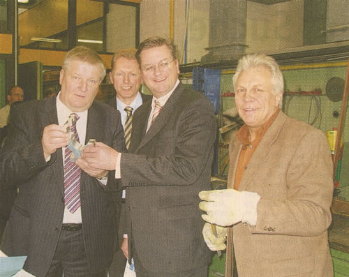 Rotenburger Kreiszeitung vom 19. November 2005 Alle Chancen nutzen Niedersächsischer Landwirtschaftsminister Ehlen zu Gast bei den BBS ROTENBURG (kat) . Auch der letzte Tag der Ausbildungsmesse der Berufsbildenden Schulen Rotenburg (BBS) war ein Erfolg. Gestern zu Gast war der Niedersächsische Landwirtschaftsminister Hans-Heinrich Ehlen, der sich in den BBS einen Eindruck von der vorbildlichen Aktion verschaffen wollte. 1200 Schüler aus dem Landkreis und rund 300 Schüler der BBS bevölkern die Stände der 52 Aussteller – „Die doppelte Menge im Vergleich zu gestern“, freut sich Bernd Weier, Studiendirektor an den BBS. Zwischen den Schülern tauchen auch andere Gäste auf, darunter der Niedersächsische Landwirtschaftsminister Hans-Heinrich Ehlen, Bürgermeister Detlef Eichinger und der CDU-Bundestagsabgeordnete Reinhard Grindel. Sie besichtigen die Schauräume und Messestände, um sich über die Berufswege für junge Leute zu informieren. Wolf Hertz-Kleptow, Leiter der BBS, führt die Delegation von der Bewerberbörse „Jump“ zu den Schauräumen der Innungen und der unterschiedlichen Fachbereiche bis hin zu den Ständen der Banken und der Agentur für Arbeit. „Ich bin echt beeindruckt“, fasst Ehlen seinen ersten Eindruck von der Veranstaltung zusammen. Er findet es wichtig, dass die Aussteller den Jugendlichen die Möglichkeit bieten, das Gesehene per Internet in Ruhe nachzulesen. „Ich habe ja vier Kinder und da ist das an der Tagesordnung, sich über die Berufswahl Gedanken zu machen“, ergänzt Ehlen. Er rät, alle Informations- und Beratungsangebote zu nutzen. Auch Detlef Eichinger betont, dass die Stadt dieses Projekt gerne unterstütze und verrät seinen alternativen Berufswunsch – Pilot. „Aber das hat irgendwie nicht geklappt“, sagt er mit einem Lächeln. Reinhard Grindel freut sich über die Möglichkeit, an den Ständen vieles auszuprobieren. „Das praktische Händchen wird heute immer wichtiger“, betont Grindel. Das können auch der Dachdeckermeister Hermann Oetjen und Ronald Wendt, BBS-Fachpraxislehrer Bereich Bau, aufgrund ihrer langjährigen Erfahrungen mit Jugendlichen bestätigen.