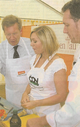 Gemeinsam mit dem Landwirtschaftsminister Hans-Heinrich Ehlen und der Moderatorin Ruth Moschner schwang Wulff den Kochlöffel und bereitete unter Anleitung des Bio-Spitzenkochs Alfred Fahr pochiertes Rinderfilet mit Meerrettichsoße und „Kleiner Linda“ zu.