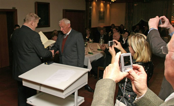 „Ehrfürchtig“ nimmt der zu Ehrende den von Minister Ehlen vorgelesenen Text der Verleihungsurkunde für das Verdienstkreuz am Bande des Verdienstordens der Bundesrepublik Deutschland in sich auf.