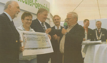 Zevener Zeitung vom 10. Juli 2004 Landjugend gewinnt den Tarmstedter Marketingpreis Jury zeichnet die 72-Stunden-Aktion aus – „Zeichen gesetzt für die Jugendarbeit im ländlichen Raum“ Tarmstedt (lh) „Ich habe mit allem gerechnet. Nur nicht damit, dass wir gewinnen.“ Die Vorsitzende der Niedersächsischen Landjugend, Sabine Ringen, war gestern regelrecht geplättet: Soeben hatte sie von Landwirtschaftsminister Heiner Ehlen erfahren, dass die Landjugend für ihre landesweite 72-Stunden-Aktion den mit 1500 Euro dotierten „Marketingpreis der Tarmstedter Ausstellung“ erhält. „Wir haben viele Liebe und Arbeit in die 72-Stunden-Aktion gesteckt“, sagte die Vorsitzende aus Hanstedt im Gespräch mit unserer Zeitung. Umso mehr freue sie sich, dass diese Mühe anerkannt und belohnt wird. Zur 72-Stunden-Aktion: Die Aufgaben für die Jugendlichen kamen aus den Bereichen Dorferneuerung, Kulturpflege und Naturschutz und sollten einen starken Bezug zum öffentlichen Leben haben. Ohne finanzielle Unterstützung mussten die jungen Leute Material und Maschinen besorgen sowie ehrenamtliche Helfer mobilisieren. Die Aufgaben, die die Jugendlichen erledigten, reichten von der Gestaltung eines Dorfgemeinschaftsplatzes und eines Jugendtreffs über die Renovierung eines Ehrenmals bis hin zum Bau eines Waldlehrpfades. Hans-Heinrich Ehlen überreichte den mit 1500 Euro dotierten Preis, der zum 6. Mal von der Tarmstedter Ausstellung in Zusammenarbeit mit der Zevener Zeitung und der „Land & Forst“ ausgeschrieben worden ist. Der Wettbewerb belohnt Konzepte für die Öffentlichkeitsarbeit in der Landwirtschaft und im ländlichen Raum. Zu den weiteren nominierten Projekten zählte die „Landpartie Zeven“, das Info- und Spielmobil des Landfrauenvereins Selsingen, die Niedersächsische Milchstraße der Samtgemeinde Himmelpforten sowie das Landvolk Wesermünde mit einer ideenreichen Öffentlichkeitsarbeit.