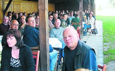 Zevener Zeitung 03. September 2004 Ein Ministerium macht „Betriebsausflug“ aufs Land Mitarbeiter des niedersächsischen Landwirtschaftsministers Ehlen waren in Kalbe zu Besuch Kalbe (rsk). Alle Hände voll zu tun hatten Landwirtschaftsminister Hans-Heinrich Ehlen, seine Frau Monika, Tochter Jenny und Sohn Jan am Montag. Im Rahmen des diesjährigen „Betriebsausfluges“ machten über 100 Mitarbeiter des Ministeriums in Kalbe Station. Da der Minister selbst die Aufgabe übernommen hatte, für gutes Wetter zu sorgen, kam er zeitweise ganz schön ins Schwitzen. „Heute morgen war hier so ein schönes Wetter, dass Monika und ich gesagt haben, wir müssen das draußen unterm Dach machen,“ sagte Hans-Heinrich Ehlen noch mit dem Schirm in der Hand, nachdem gerade ein gewaltiger Regenschauer niedergegangen war. Aber dann zogen die Wolken ab, der Besuch kam mit etwas Verspätung und als die beiden großen Reisebusse schließlich angefahren kamen, konnte der Chef des Ministeriums die Ausflügler bei bestem Sonnenwetter willkommen heißen. Die Reise hatte die Mitarbeiter des Ministeriums von Hannover aus zunächst nach Bremen geführt. Dort stand, je nach Neigung, eine Weser- und Hafenrundschaft, eine Stadtführung oder die Besichtigung des Rathauses auf dem Programm. Es gab Kaffee und Kuchen. Anschließend ging es mit Vater und Sohn in zwei Gruppen zu einem Rundgang durch Kalbe und zu einer Hofbesichtigung. Am Dorfgemeinschaftshaus erführen die Besucher, dass dieses die ehemalige Schule sei und dass Ehlen früher als Schüler immer vom Küchenfenster aus sehen konnte, wann der Lehrer kam. „Eher brauchte ich ja auch nicht loszugehen,“ erläuterte er schmunzelnd seinen interessierten Zuhörern. Die Dorferneuerung kam ebenso zur Sprache wie die vielen schönen alten Häuser des Dorfes und ein heiteres Stückchen Familiengeschichte. Danach gab es noch einen kurzen Einblick in den Betrieb Ehlen, den jetzt sein Sohn Jan führt. Bevor die Hannoversche Regierungsmannschaft zur Heimfahrt wieder in die Busse Stieg, fanden beide Gruppen des Rundgangs noch einmal zu einem gemütlichen Klönschnack zusammen.