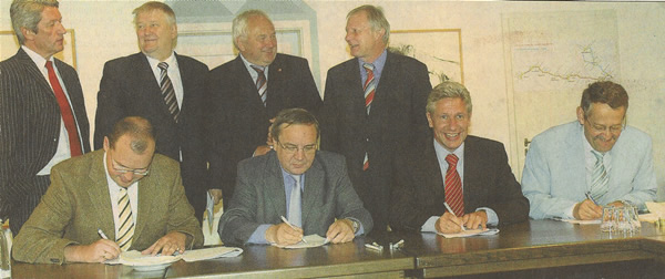 Zufriedene Gesichter gab es gestern im Königin-Christinen-Haus bei der Unterzeichnung des Vertrages über die neue Schnellbuslinie – den OsteSprinter. Hinten von links: Dietmar Opalka (Geschäftsführer Verkehrsgesellschaft Nord-Ost-Niedersachsen, Heiner Ehlen (MdL), Heiner Schönecke (MdL), Ulrich Koch (Geschäftsführer EVB). Am Tisch von links: Stefan Tiemann ( Bürgermeister Samtgemeinde Sittensen), Heinz Peimann (Dezernent Landkreis Rotenburg), Rainer Rempe (Erster Kreisrat Harburg ) und Johann Klintworth ( Bürgermeister Samtgemeinde Zeven).