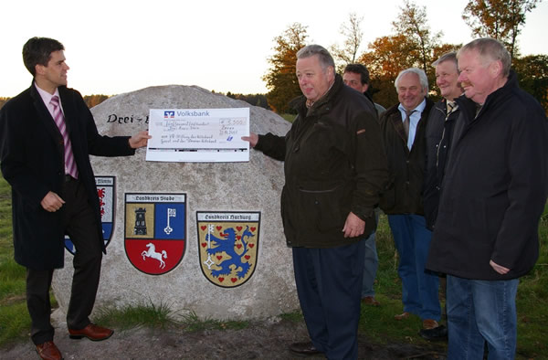 Johann Heins, Vorstand der Zevener Volksbank eG, im Namen seines Hauses, der Volksbank Geest und der niedersächsischen Stiftung der Volks- und Raiffeisenbanken an den Heimatverein einen Scheck über 5.500 Euro. „Dieser Betrag ist aus gemeinsamen Mitteln geflossen, denn auch wir möchten dazu beitragen, Kulturgut der Nachwelt zu erhalten und der Öffentlichkeit zugänglich zu machen“, führte Heins aus. Heimatvereinsvorsitzender Wilhelm Gohde bedankte sich für die großzügige Spende und versprach, den Schaukasten stets aktuell zu halten. Er hoffe, das der Weg noch touristisch ausgebaut werde und viele Wanderer und Radfahrer in diese Idylle kämen, um hier auszuruhen und den Stein zu besichtigen. Hartmut Vollmer merkte an, dass diese Stätte in die offiziellen Gästeführungen künftig mit einbezogen werden solle und der Landkreis sowie der Tourow den Weg dorthin erschließen und beschildern wollten.
