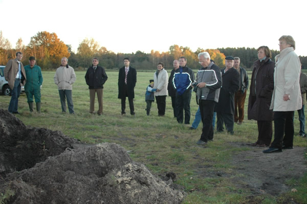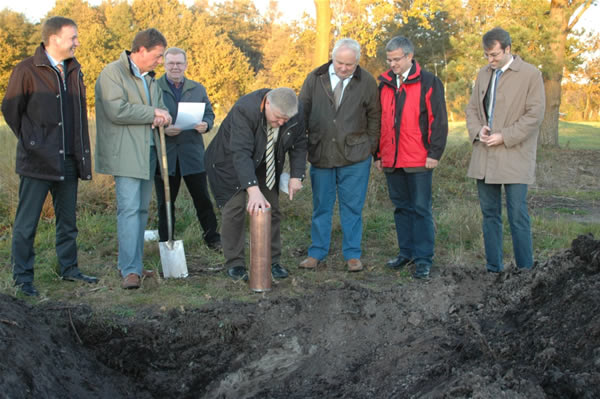 Initiator der gesamten Aktion ist Hans-Heinrich Ehlen, niedersächsischer Minister für den ländlichen Raum, Ernährung, Landwirtschaft und Verbraucherschutz, der seinerzeit die Anregung von Manfred Klindworth, dessen Familie in Besitz dieser Fläche steht, aufgenommen und gemeinsam mit den Landtagsabgeordneten Heiner Schönecke (Harburg) und Helmut Dammann-Tamke, Stade, umgesetzt hatte. Dem Minister oblag es jetzt auch, die inhaltsschwere Kapsel in das Erdloch zu versenken. Seine Landtagskollegen gaben einige Schaufeln Sand dazu, bevor mit technischem Gerät der Boden fest verschlossen wurde. „Scheine sind hier übrigens nicht zu finden“, merkte Ehlen augenzwinkernd an. Und: „Dieser Stein ist als Begegnung der Zeit zu sehen und kann eine richtige Wallfahrtsstätte werden“. Anwesend waren neben den Landtagsabgeordneten auch Vertreter der betreffenden Landkreise,