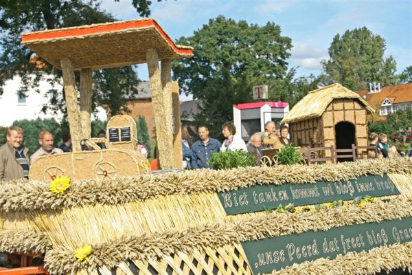 Angeführt von den Mitgliedern der Heeslinger Landjugend rollten die zum Teil prachtvollen Erntewagen durch den Ort. Themenwagen zum Zeitgeschehen wie Milchlieferstopp und Energiekosten wechselten mit aufwändig und in mühevoller Kleinarbeit dekorierten Gefährten. Alle Jahre Wieder mit dabei ist der knallrote Hanomag mit Familie Harms auf dem Leiterwagen und der grasgrüne Deutz mit den Feuerwehr-Oldies und ihrer alten Handdruckspritze.