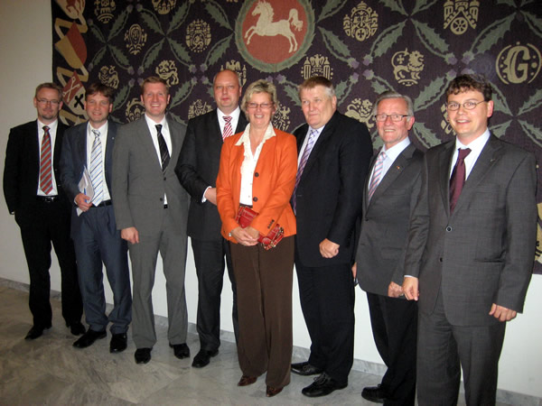 Meinungsaustausch in Hannover (von links): Gerd Hachmöller (Wirtschaftsförderer des Landkreises), Dr. Torsten Lühring (Erster Kreisrat), Jan-Christoph Oetjen (FDP-Landtagsabge-ordneter), Verkehrsminister Jörg Bode (FDP), Mechthild Ross-Luttmann (CDU-Landtagsabgeordnete), Hans-Heinrich Ehlen (CDU-Landtagsabgeordneter), Bürgermeister Heinrich Willenbrock (CDU) und Christoph Reuther (Wirtschaftsförderer der Samtgemeinde Zeven).