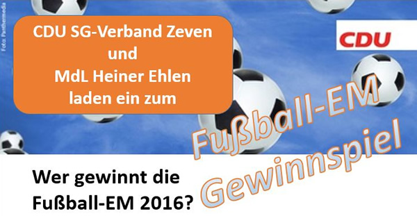 Zeven. Der Landtagsabgeordnete Hans-Heinrich Ehlen und der CDU-Samtgemeindeverband Zeven bieten ein Gewinnspiel an, bei dem die Teilnehmer diese Frage beantworten sollen: "Wer gewinnt die Fußball-Europameisterschaft 2016 in Frankreich?" Die Tipps sind zu senden per E-Mail an buero-zeven@heiner-ehlen.de oder per Post an CDU-Bürgertreffpunkt, Lange Straße 23, 27404 Zeven - in beiden Fällen nicht den Absender vergessen.
