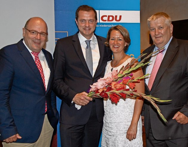 Nach der Wahl von Oliver Grundmann zum Direktkandidaten im Bundestags-Wahlkreis 30: Zu den ersten Gratulanten von Grundmann und seiner Ehefrau Anja gehörten BDA-Hauptgeschäftsführer Steffen Kampeter (links) und der Rotenburger CDU-Kreisvorsitzende Hans-Heinrich Ehlen.