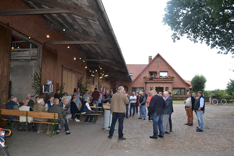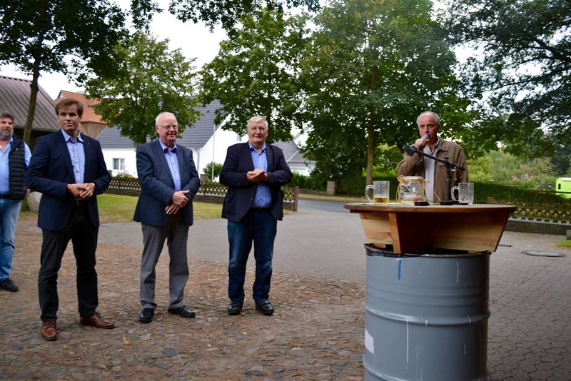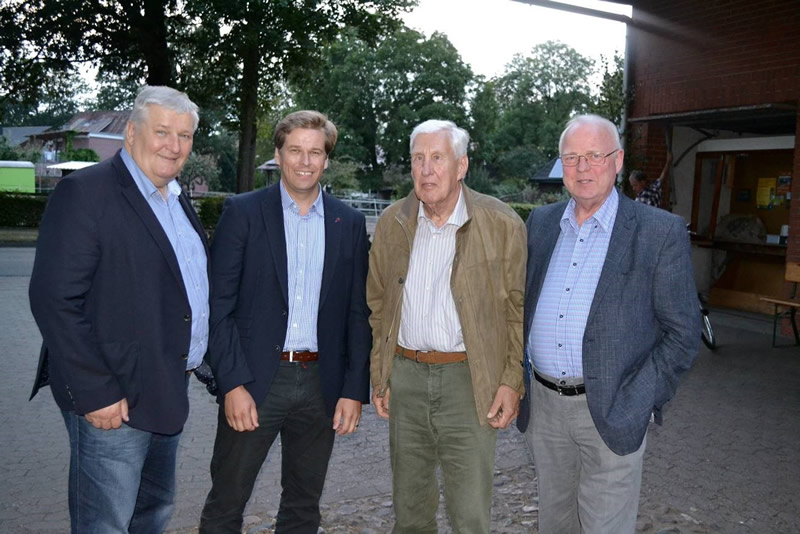 (von links) GV -Vorsitzender Lothar Sause; Bürgermeister und Kreistagsabgeordneter Rolf Lüdemann, Heiner Ehlen bei der Begrüßung durch den Hausherrn