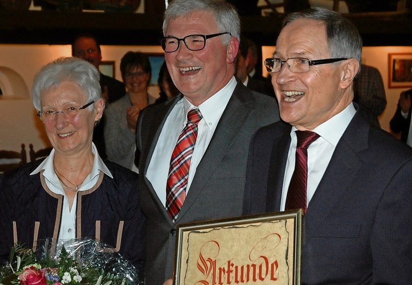 Heinz-Hermann Evers (rechts) ist Ehrenbürgermeister von Sittensen. Lachend hält er die Ernennungsurkunde in den Händen. Mit ihm freuen sich seine Frau Inge und Sittenses Bürgermeister Diedrich Höyns. Fotos Brandt